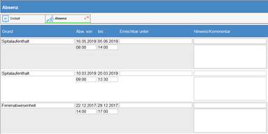 In dem Register „Absenz“ werden externe Abwesenheiten, zum Beispiel Spital- oder Ferienaufenthalte angezeigt. Externe Absenzen beeinflussen die Faktura und müssen aus diesem Grund umgehend der Bewohneradministration gemeldet werden, damit diese durch sie erfasst werden können.