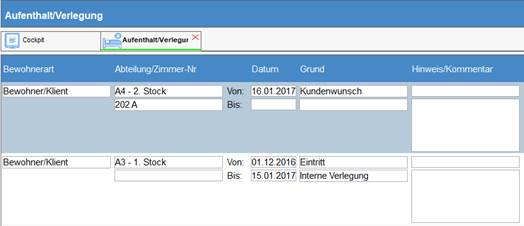 Unter dem Register „Aufenthalt/Verlegung“ werden interne Verlegungen erfasst, wie beispielsweise ein Zimmer- oder Abteilungswechsel.