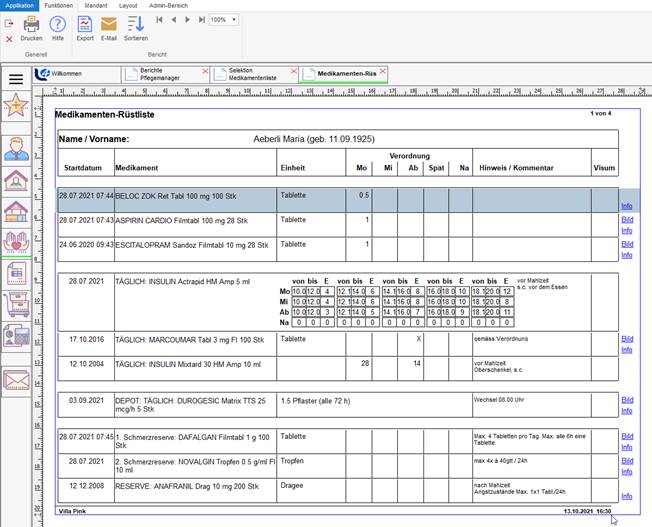 Der Bericht wird der Selektion entsprechend aufbereitet und am Bildschirm angezeigt. Der erste Datensatz ist grau markiert. Über die Pfeiltasten kann durch die Datensätze navigiert werden.