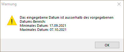 Ein eingegebenes Datum kann vom System überprüft werden. In der Stammdatei Datumskontrolle (Reg. Admin-BereichStammdatenDatumskontrolle) kann pro Datumsfeld ein Datumsbereich mit maximalen Minus- und Pluszahlen gesetzt werden. Wird ein Datum erfasst, welches nicht in den entsprechenden Bereich fällt, erscheint eine Fehlermeldung: