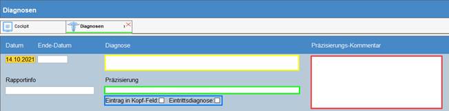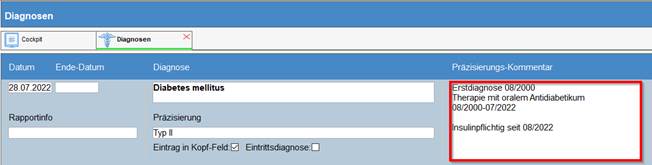 Die Präzisierung wird bei Steuerung via Eintrag in Kopf-Feld bzw. Eintrittsdiagnose im Cockpit unter Haupt-Diagnosen / Allergien eingeblendet.