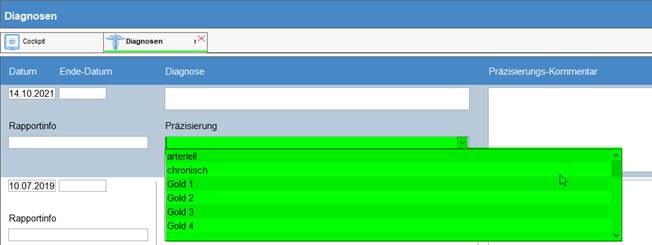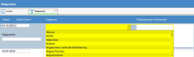 Im Dropdown-Feld Diagnose (gelb markiert), können Sie aus einer Auswahl die gewünschte Diagnose auswählen.