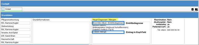 Wird eine dieser Rubriken im Register Diagnosen angeklickt, erscheint die Diagnose im Cockpit unter der Rubrik Haupt-Diagnosen / Allergien.