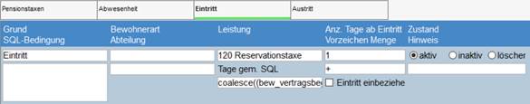Bestimmen Sie ob die Leistung am Tag des Eintrittes fakturiert werden soll oder nicht. Falls beispielsweise der Bewohner am 10.10. eintritt und die Anz. Tage mit -5 erfasst wurde, wird die Leistung bei deaktivierter Option vom 5.10. – 9.10. verrechnet. Bei aktivierter Option wird sie vom 6.10. – 10.10. fakturiert.