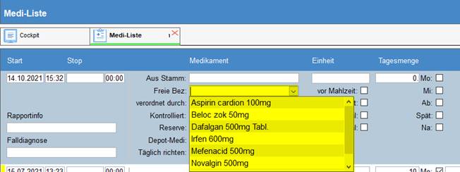 Es ist jederzeit möglich ein Medikament direkt im Auswahlfeld Freie Bez. mittels Texteingabe zu erfassen. Dieses Medikament wird nicht zur weiteren Auswahl gespeichert und muss bei dem nächsten Gebrauch erneut manuell erfasst werden.