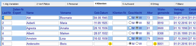 Pflichtfelder der beiden Kapitel Personal und Klienten, welche nicht befüllt sind, werden mit einem Ausrufezeichen gekennzeichnet.