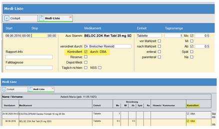 Nach dem Erfassen des neuen Medikamentes kann eine Zweitperson (z.B. Arzt, Dipl. Pflegefachperson) die Eingabe mittels der Verordnung überprüfen und mit der Aktivierung der Checkbox Kontrolliert visieren. Diese Möglichkeit besteht auch auf der Übersicht. Somit ist die Eingabe sowie Kontrolle der Medikamentenerfassung nachvollziehbar.