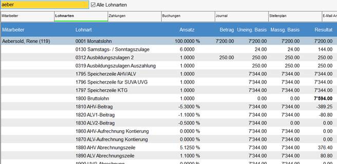 In dieser Untertabelle können Sie die berechneten Lohnarten überprüfen. Über das Kontrollkästchen Alle LA kann gesteuert werden, ob sämtliche Lohnarten, also auch die technischen Berechnungslohnarten, oder nur die druckbaren Lohnarten angezeigt werden sollen. Im Feld Suche kann nach einem bestimmten Mitarbeiter gesucht werden, indem die Anfangsbuchstaben des Namens eingegeben werden und mit der Tabulatoren-Taste bestätigt wird.