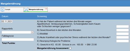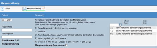 In dem ersten Bereich des Assessments MNA wird ein Screening durchgeführt. Dazu muss zwingend eine Grösse und ein Gewicht in den Vitalwerten hinterlegt werden, damit der BMI (Body-Mass-Index) berechnet werden kann.