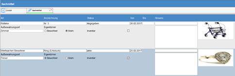 In diesem Register können Sachmittel, wie beispielsweise Schlüssel, Lagerungsmaterialien, Pflegehilfsmittel und persönliches Inventar erfasst werden. Ebenfalls können von den einzelnen Gegenständen Fotos hinterlegt werden. (Funktionalität identisch wie im Register Wundbeschreibung).