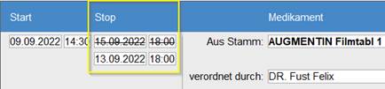 Falls ein Medikament für eine begrenzte Zeitspanne verordnet wird, geben Sie das Stop-Datum bereits bei der Verordnung ein. Sollte die Medikamenteneinnahme wider Erwarten früher beendet werden, wird ein zweites Stop-Datum zur Verfügung gestellt.