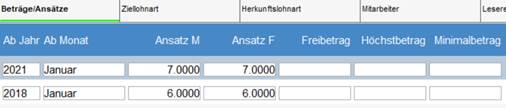 Diese Untertabelle wird nur angezeigt, wenn das ELM-Modul aktiviert wurde. Die Felder Ansatz M, Ansatz F, Frei-, Höchst- und Minimalbetrag werden in der Hauptmaske ausgeblendet. Stattdessen können diese Angaben hier zeitabhängig erfasst werden.