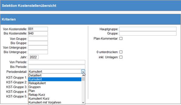 Dies ist der umfassendste Standard-Bericht der Betriebsbuchhaltung. Über das Selektionsfeld Periodendetail kann der Bericht unterschiedlich dargestellt werden. Falls über den Menüpunkt Plan budgetiert wurde, können die Ist- mit den Plan-Zahlen verglichen werden. Allfällig in der Betriebsbuchhaltung erstellte Umlagen können bei Bedarf berücksichtigt werden.