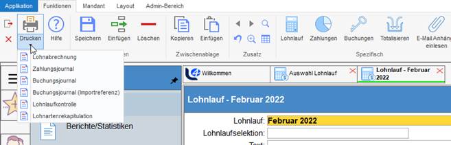 Es stehen Ihnen hierfür die bereits erwähnten Untertabellen des Lohnlaufes aber auch diverse Journale zur Verfügung. Klicken Sie im geöffneten Lohnlauf auf den kleinen schwarzen Pfeil unterhalb des Symbols Drucken.