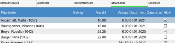 Es werden alle Mitarbeiter aufgeführt, bei welchen die Lohnart in der Untertabelle Lohnarten eingefügt wurde.