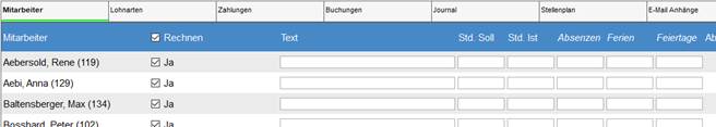 Diese Spalte ist nur eingeblendet, wenn das ELM-Modul aktiviert ist (s. Anleitung Lohnmeldung ELM 4.0 für UVG, UVGZ, KTG, QST). Es wird zur Kontrolle der quellensteuerrelevante Kanton angezeigt. |