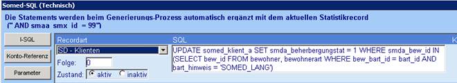 Damit gewährleistet ist, dass mit dem Befehl nicht versehentlich andere SOMED-Statistiken (z.B. aus Vorjahren) tangiert werden, wird dem Befehl automatisch eine WHERE-Klausel hinzugefügt, die den Befehl auf die aktuelle SOMED-Statistik eingrenzt.