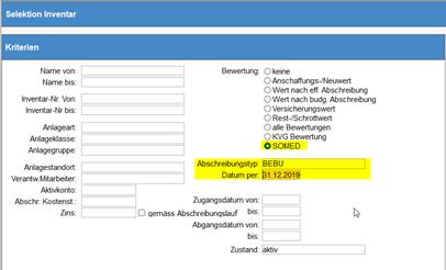 In der Selektionsmaske unter Bewertung SOMED auswählen und mindestens den Abschreibungstyp eingrenzen und das per-Datum eingeben. Der generierte Bericht kann eins zu eins im SOMED Fragebogen online eingegeben werden.