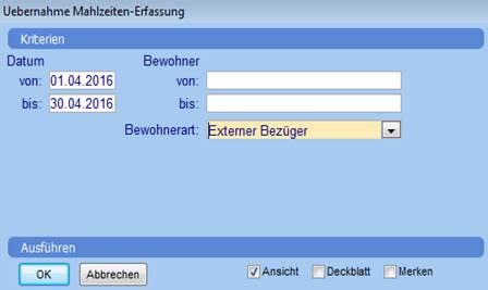 Für Heimbewohner ist die Fakturierung der Mahlzeiten meist kein Thema, da die Verpflegung in der Grundtaxe enthalten ist. Für externe Leistungsempfänger allerdings können die bezogenen Mahlzeiten bei Bedarf in das Programmmodul Leistungsfakturierung übernommen und verrechnet werden.