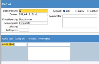 Damit das Bett belegbar ist, muss mindestens ein von-Datum angegeben werden. Falls ein Bett nur sporadisch zum Einsatz kommt, können Sie die Gültigkeit(en) begrenzen. Durch Einfügen weiterer Einträge können Sie die Zeiträume auflisten, in welchen das Bett verwendet wird. In der Belegungsübersicht und den Auswertungen werden die Gültigkeiten berücksichtigt.
