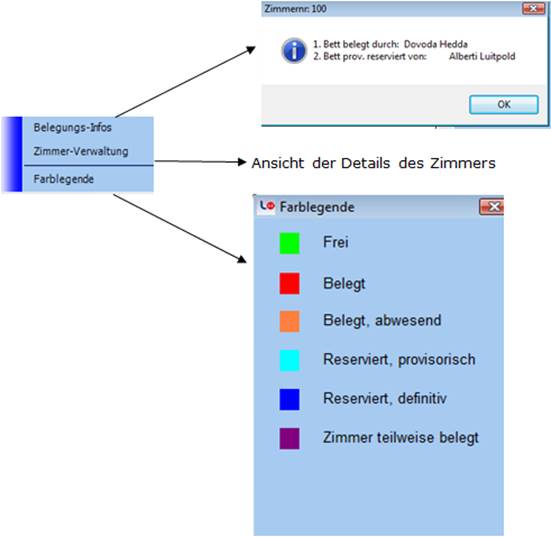 die Belegungs-Infos, die Zimmer-Verwaltung oder die Farblegende aufrufen.