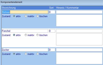 Die Komponentenelemente werden einerseits bei den Menükomponenten und andererseits bei den entsprechenden Bewohnern (Mahlzeiten-Untertabelle Unerw. Komponente) erfasst. Bei der Mahlzeiten-Erfassung erscheint die Frage, ob das Gericht trotzdem bestellt werden soll, falls das Komponentenelement sowohl im Menü enthalten als auch beim Bewohner hinterlegt ist.