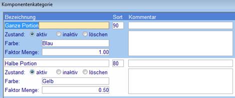 Erfassen Sie die verschiedenen Portionengrössen mit einem Faktor. Beim Bewohner können Sie pro Mahlzeitenart (z.B. Morgenessen, Mittagessen, Abendessen) eine Komponentenkategorie hinterlegen, welche jedoch bei Bedarf über die Mahlzeiten-Erfassung für eine einzelne Mahlzeit übersteuert werden kann.