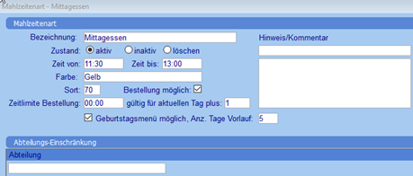 Hier kann hinterlegt werden, bis wann die Bestellung für den aktuellen Tag aufgenommen werden kann. Ist die Zeitlimite überschritten, erscheint bei der Mahlzeiten-Erfassung eine Fehlermeldung. |
