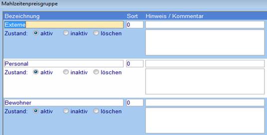Defninieren Sie verschiedene Preisgruppen. Die Preise können auf der Menükomponente oder dem Menütyp pro Komponentenkategorie (z.B. halbe Portion, ganze Portion) und Preisgruppe hinterlegt werden.