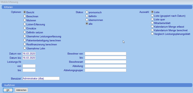 Die mobil erfassten Leistungen (z.B. mit unserer App Leistungserfassung, welche nach Lizenzierung auf iPads und iPhones zur Verfügung steht oder mit einem Fremdprogramm wie careCoach Spitex) können unter diesem Menüpunkt in verschiedenen Berichten ausgedruckt, bei Bedarf bearbeitet und schliesslich in die zentrale Leistungserfassung im Programmmodul Leistungsfakturierung übernommen werden.