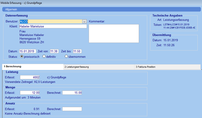 Wird die manuelle Erfassung gespeichert, startet automatisch die Berechnung für die Zeitleistungen. Danach wird diese Ansicht geleert und die Leistungen sind ebenfalls in der Maske Mobile Erfassung abrufbar und stehen zur Übernahme in die zentrale Leistungserfassung bereit.