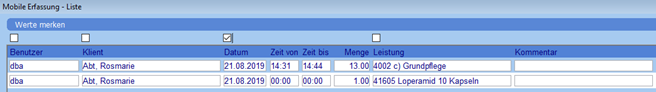 Nach der Kontrolle der erfassten Leistungen kann diese Option ausgeführt werden. Es können provisorische und/oder definitive Datensätze übernommen werden. Nach der Übernahme werden die Leistungen in das Register 2 Mobile Erfassung der zentralen Leistungserfassung gestellt. Es wird jede einzelne erfasste Leistung aufgelistet; der Zusammenzug der Leistungen erfolgt erst auf den Rechnungen.