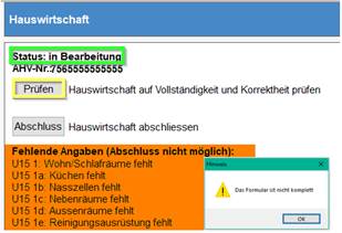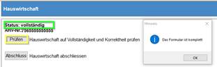 Damit das Formular abgeschlossen werden kann, müssen Pflichtfelder (sind bis auf wenige Ausnahmen alle Felder des Formulars) ausgefüllt werden. Diese Funktion muss gewählt werden, bevor das Formular Hauswirtschaft abgeschlossen wird. Vollständige Bereiche sowie fehlende Angaben werden nach der Prüfung gemeldet. Der Status in Bearbeitung bleibt bestehen, bis die Angaben vollständig sind.