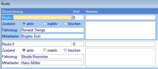 Werden Mahlzeiten ausgeliefert, können die Routen geplant werden. Definieren Sie hierfür in der Stammdatei die verschiedenen Routen. Pro Route kann das Fahrzeug und der Mitarbeiter zugewiesen werden.