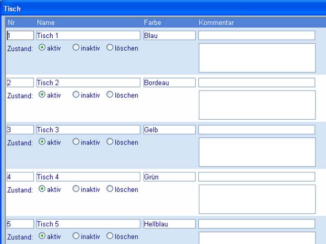 Falls die Cafeteria-Tische bedient werden, können Sie in dieser Stammdatei die einzelnen Tische erfassen.
