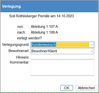Es werden der Name des Bewohners sowie das alte und neue Zimmer angegeben. Erfassen Sie den Verlegungsgrund (Stammdatei Verlegungsgrund der Bewohneradministration) und klicken Sie auf OK. Mit einem V wird die Verlegung in der Belegungsübersicht angezeigt.