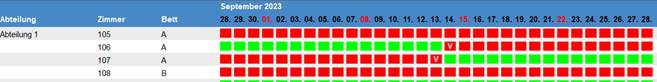 Interne Verlegungen werden per drag & drop in der Belegungsübersicht vollzogen. Zeigen Sie mit der Maustaste auf das entsprechende Bett am entsprechenden Tag und ziehen Sie bei gedrückter Maustaste den Bewohner auf ein freies Bett desselben Tages.