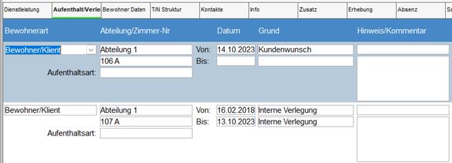 Sobald eine Verlegung ausgeführt wurde, wird im Modul Bewohneradministration in der Untertabelle Aufenthalt/Verlegung automatisch ein neuer Eintrag generiert.