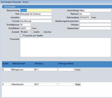 Für den Wochenplan lassen sich unterschiedliche Layouts definieren (z.B. Schriftfarbe, Rahmen, Hintergrund) um verschiedene Pläne, beispielsweise für interne und externe Gäste erstellen zu können. Für jedes Layout können die entsprechenden Mahlzeitenarten und Menütypen zugewiesen werden.